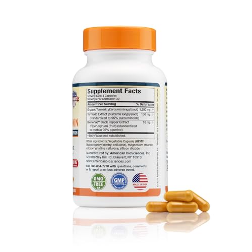 Turmeric formula enhanced with BioPerine: American BioSciences turmeric capsules contain 1500mg of turmeric curcumin powder with 95% standardized curcuminoids per serving and 10mg of BioPerine (black pepper extract)